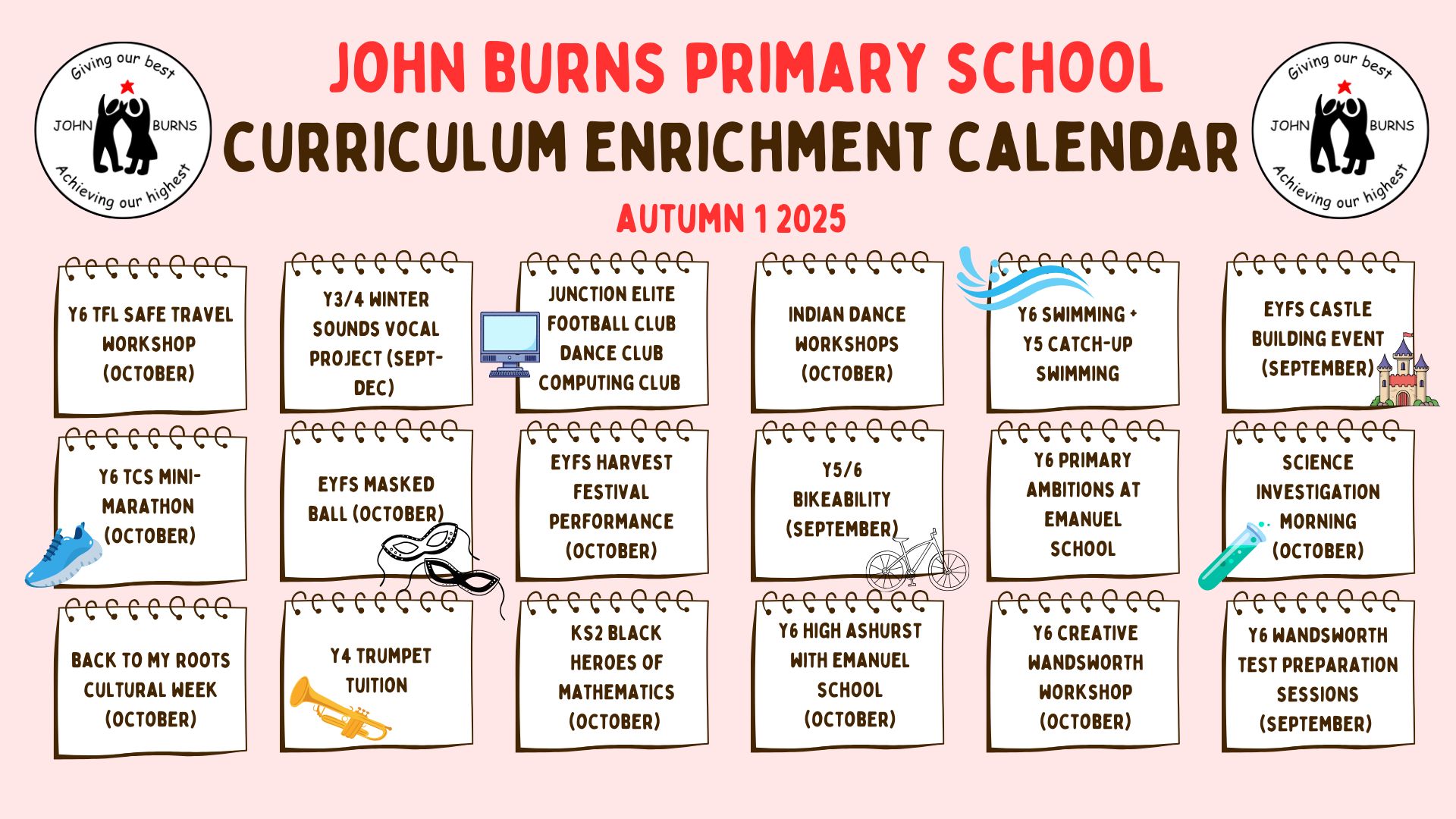 At John Burns Primary School, we are proud to offer a rich and varied programme of curriculum enrichment opportunities that enhance and extend learning beyond the classroom. These experiences are carefully planned to support our curriculum, develop pupils’ talents, and inspire curiosity, confidence, and creativity.