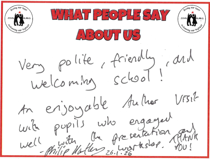 What a joy to visit John Burns Primary School! The day was extremely well organised and the staff and children were all so kind and welcoming. I ran author events for every year group in the school and the children were impeccably well-behaved, engaged, and absolutely bursting with brilliant ideas for stories. This is clearly a school that values reading for pleasure (what a beautiful library!) and that seeks to give children a full and rounded school experience. Thank you so much for inviting me.